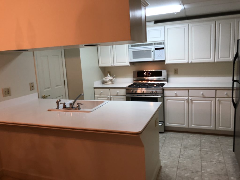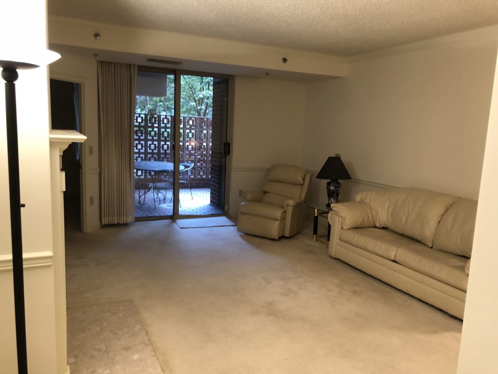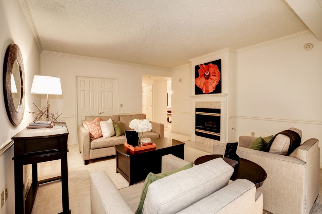 3. We rented furniture for her living room, because her sweet dogs damaged her old sofa, plus she was taking the chair to her new home before the sale. We also rented a glass table – so the table didn’t make the room smaller. We also brought in a light large rug and manipulated the perception of the room size – all these little tricks!