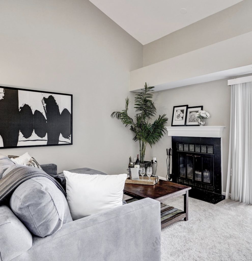 3. We rearranged the furniture so the condo looks spacious and photographs well. Notice in the photo below how all these treasured and beautiful belongings are competing for attention? And especially the large and distracting light above the fireplace. We removed it – so buyers focused on the expansive space and a beautiful fireplace.