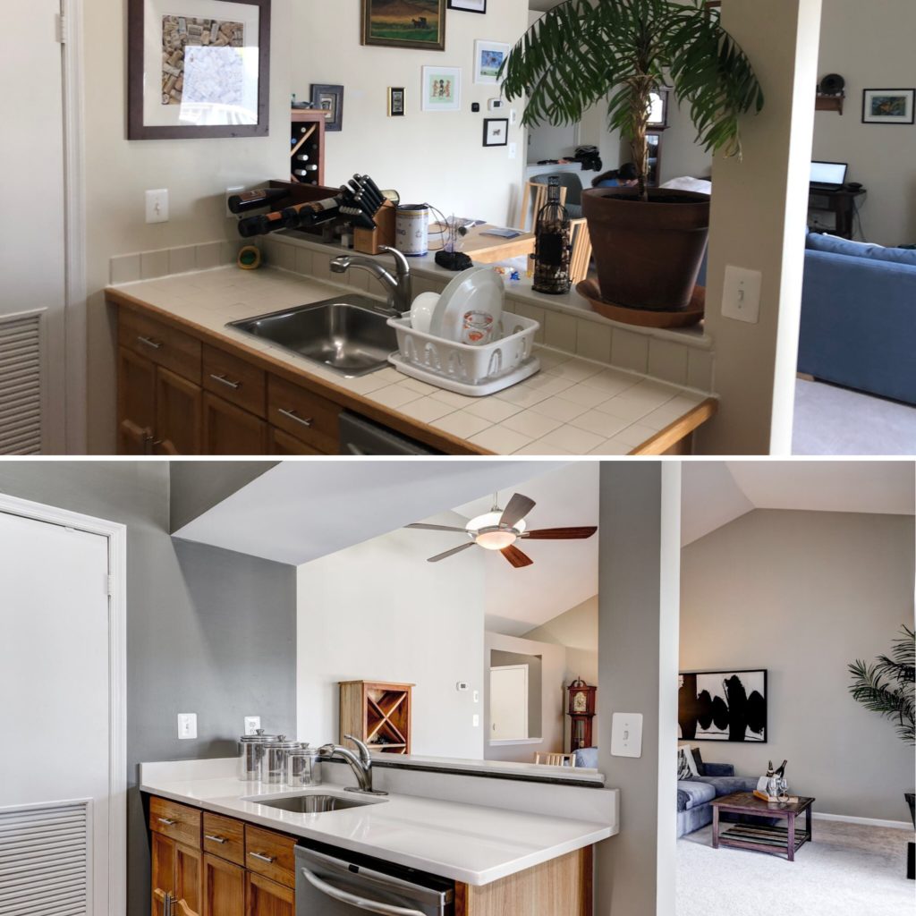 Before and after kitchen. Client had off-white tile as a counter and I knew it wasn’t going to fly with today’s buyers. So we changed it to white Quartz. ($1,850) This was a MUST change that I asked for.